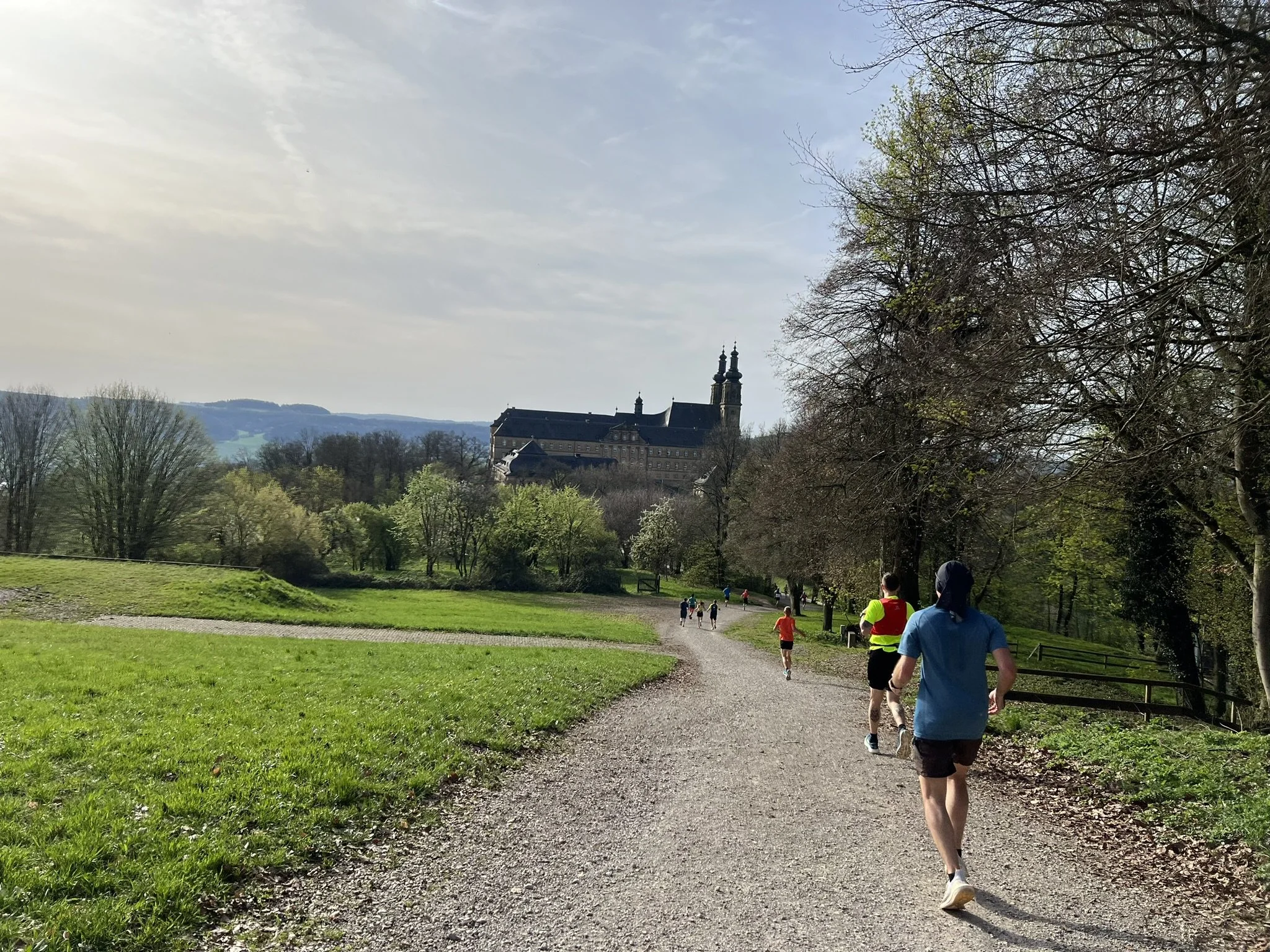 Der Obermainmarathon, auch als Landschaftslauf betitelt, passiert zahlreiche lokale Wahrzeichen. Hier Kloster Banz, etwa Kilometer 6, nach der ersten großen Steigung.